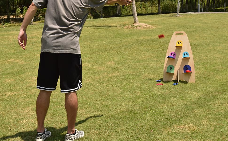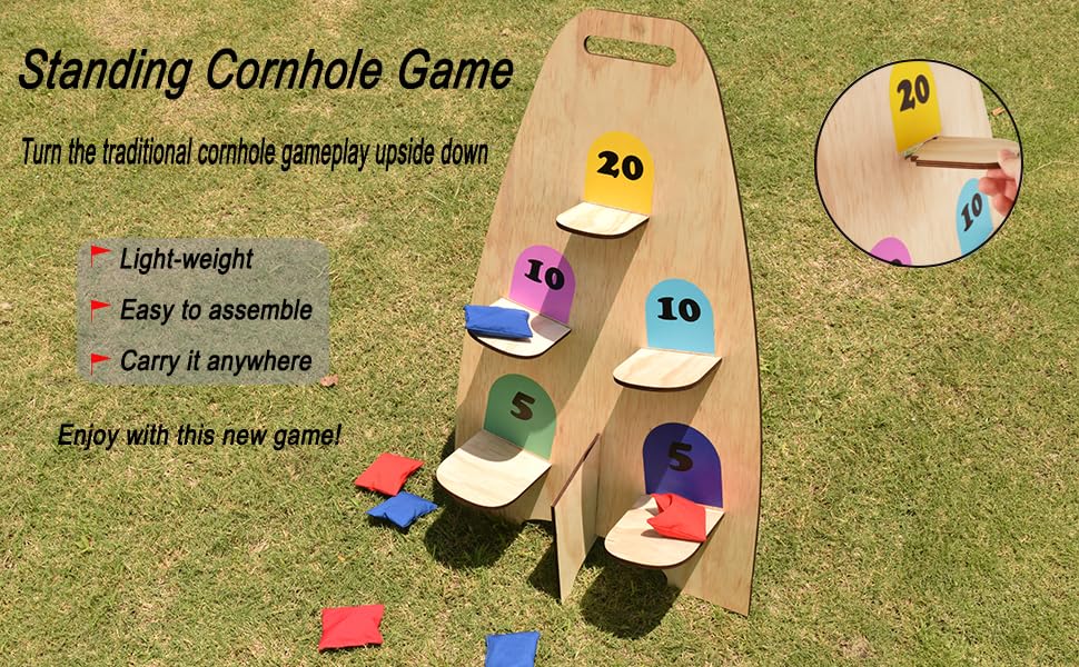 - Vertical Cornhole Game – This a new Bean Bag Game! Take cornhole style gameplay to new heights with a fun vertical game board and multiple scoring shelves.